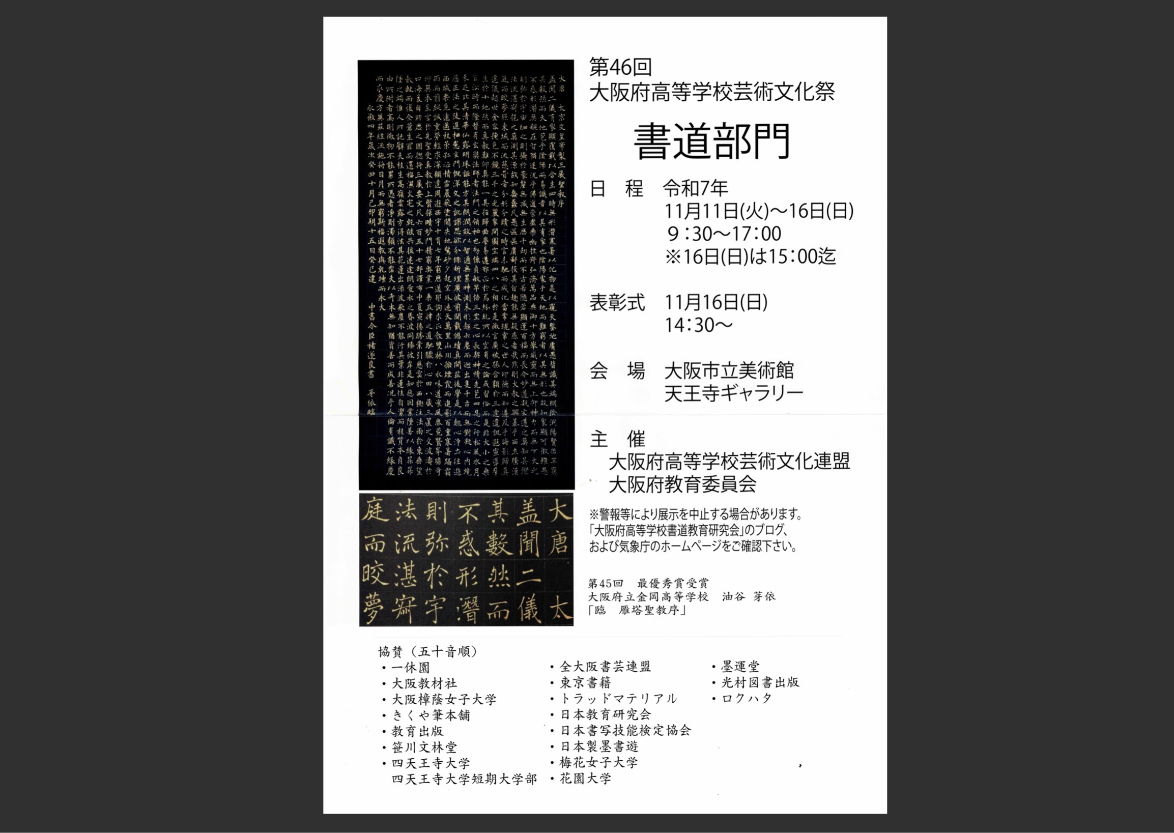 学校生活 CLUBクラブ活動 【書道部】(結果速報)第46回大阪府高等学校芸術文化祭書道部門 2025.09.24 【速報】 第46回大阪府高等学校芸術文化祭書道部門 〈入選〉 箱ひなた(3-Q) 池田知良(3-R) 令和7年11月11日(火)~11月16日(日) 大阪市立美術館・天王寺ギャラリー ご高覧賜りますようお願い申し上げます。