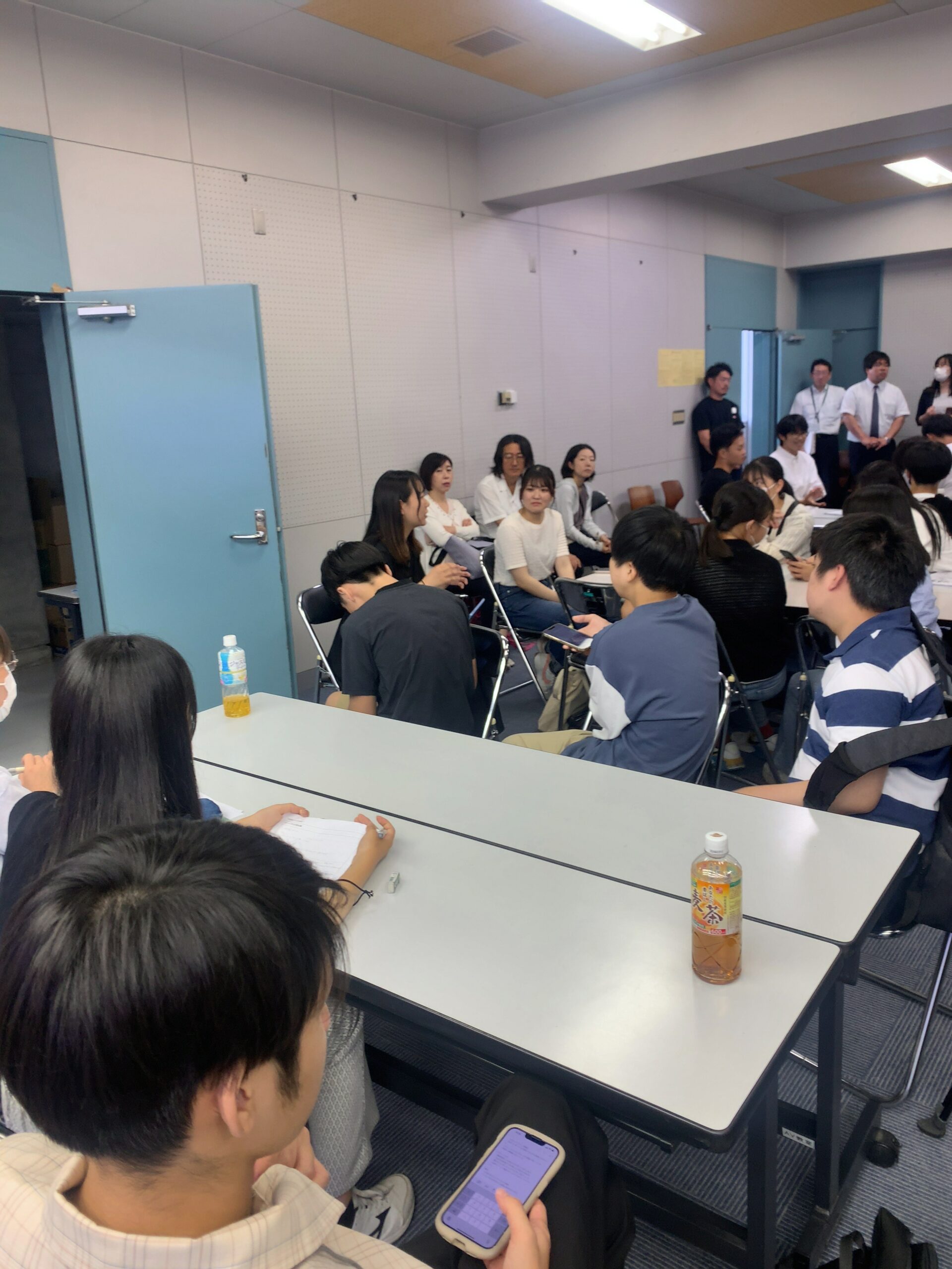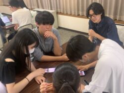 ②午後からは、東京農業大学の学生さんが9人参加してくださり、現在の研究についてプレゼンをしてくれました。その後、各班に学生さんが加わってくださり、今回のテーマである農業の課題について一緒に考えてくれました。自分たちだけでは止まってしまうアイデアに対して、熱心に助言をしてくださいました。