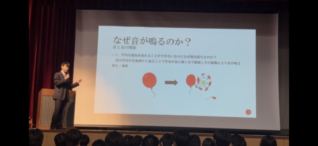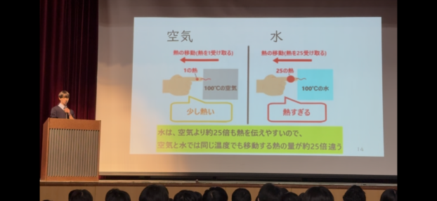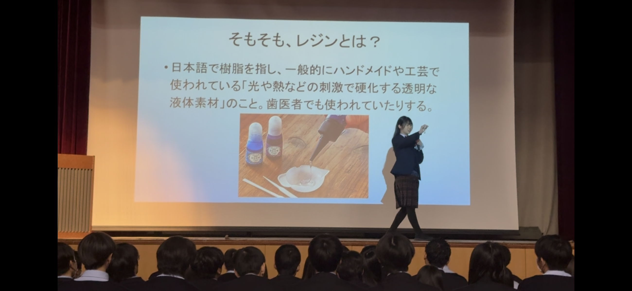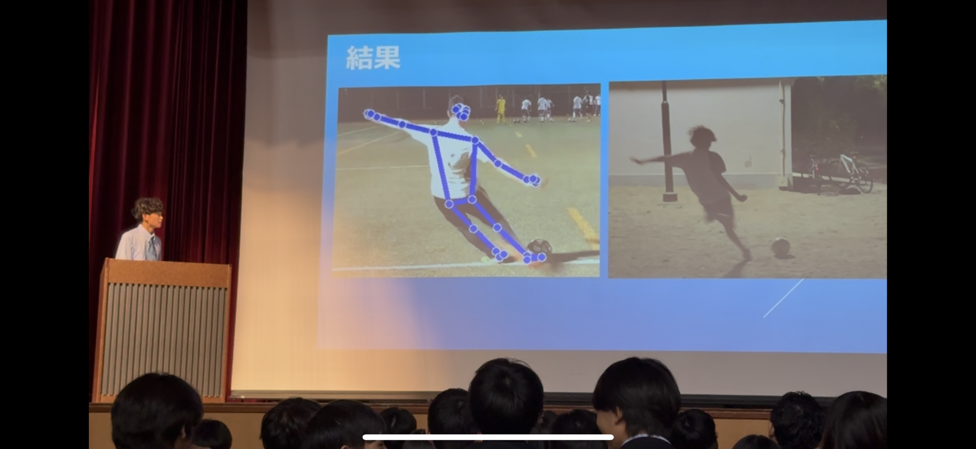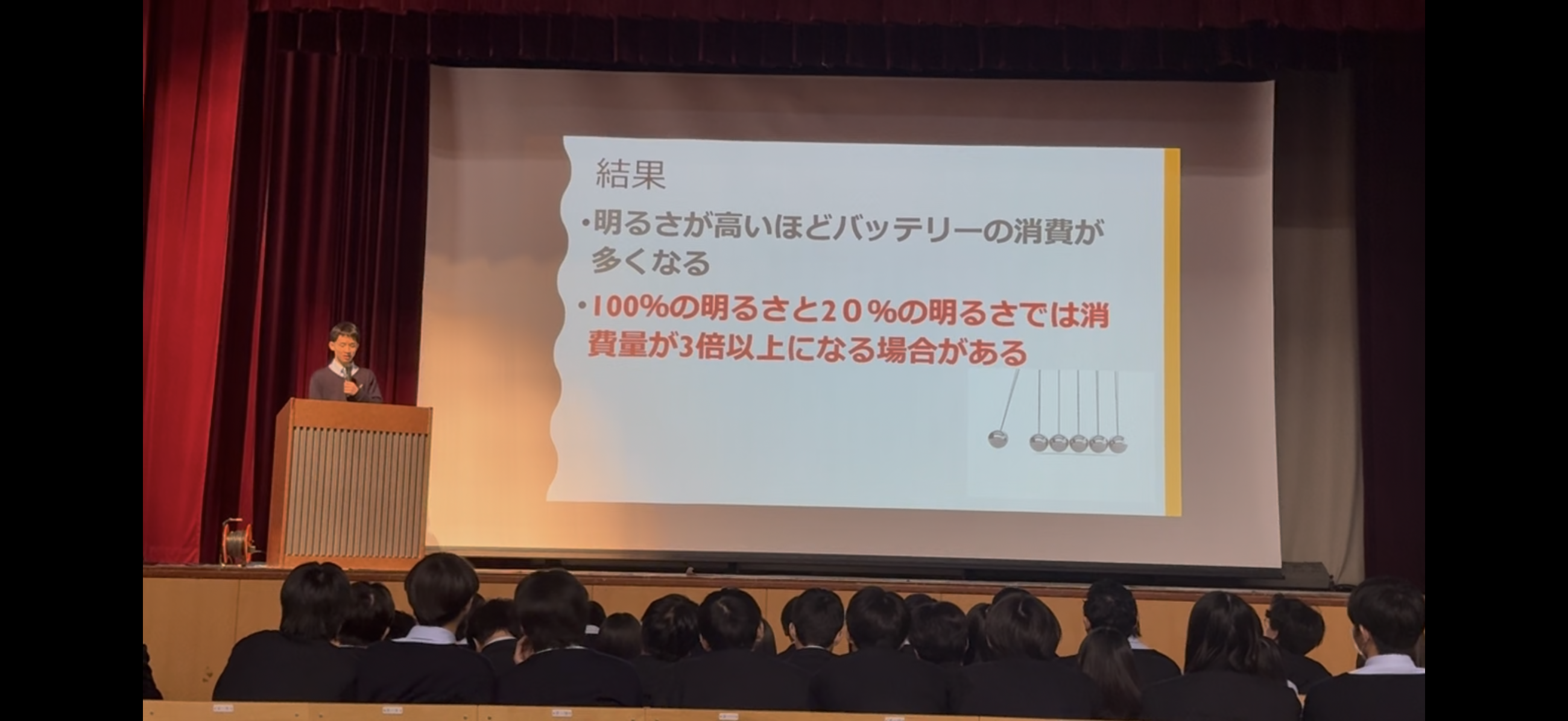 夏休み中に検証した内容を元に、生徒たちは2学期に入ってからの情報の授業でPowerPoint資料を作成し、クラス内で発表を行いました 。その中から選ばれた代表者が、今回、文理ブロック生徒の前で自身の研究成果を発表しました。