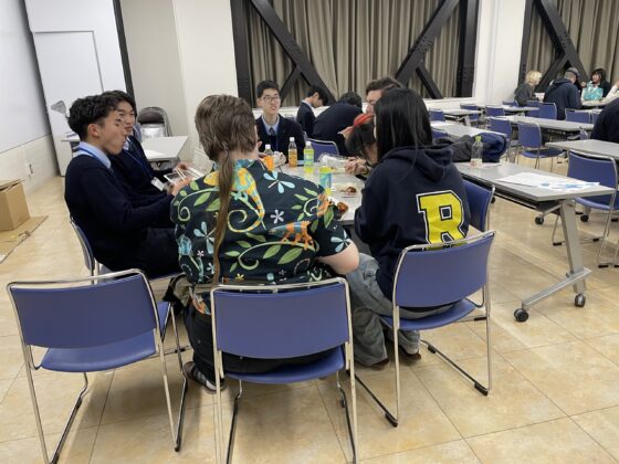ボランティア生徒と留学生で一緒にランチの時間。カフェテリアで一緒に食事券を買い、その後ランチを楽しんでいました。生徒のお弁当に興味津々な留学生、アメリカで流行っている映像の話に興味津々な大高生。日本語と英語が飛び交っていました
