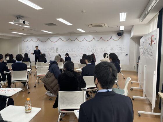 今回のプログラム運営には、25名のボランティア生徒が集まり、数日前から歓迎準備を主体的に進めてきました。当日は玄関で来校者を出迎えるところから交流が始まり、温かな雰囲気の中でスタートしました。