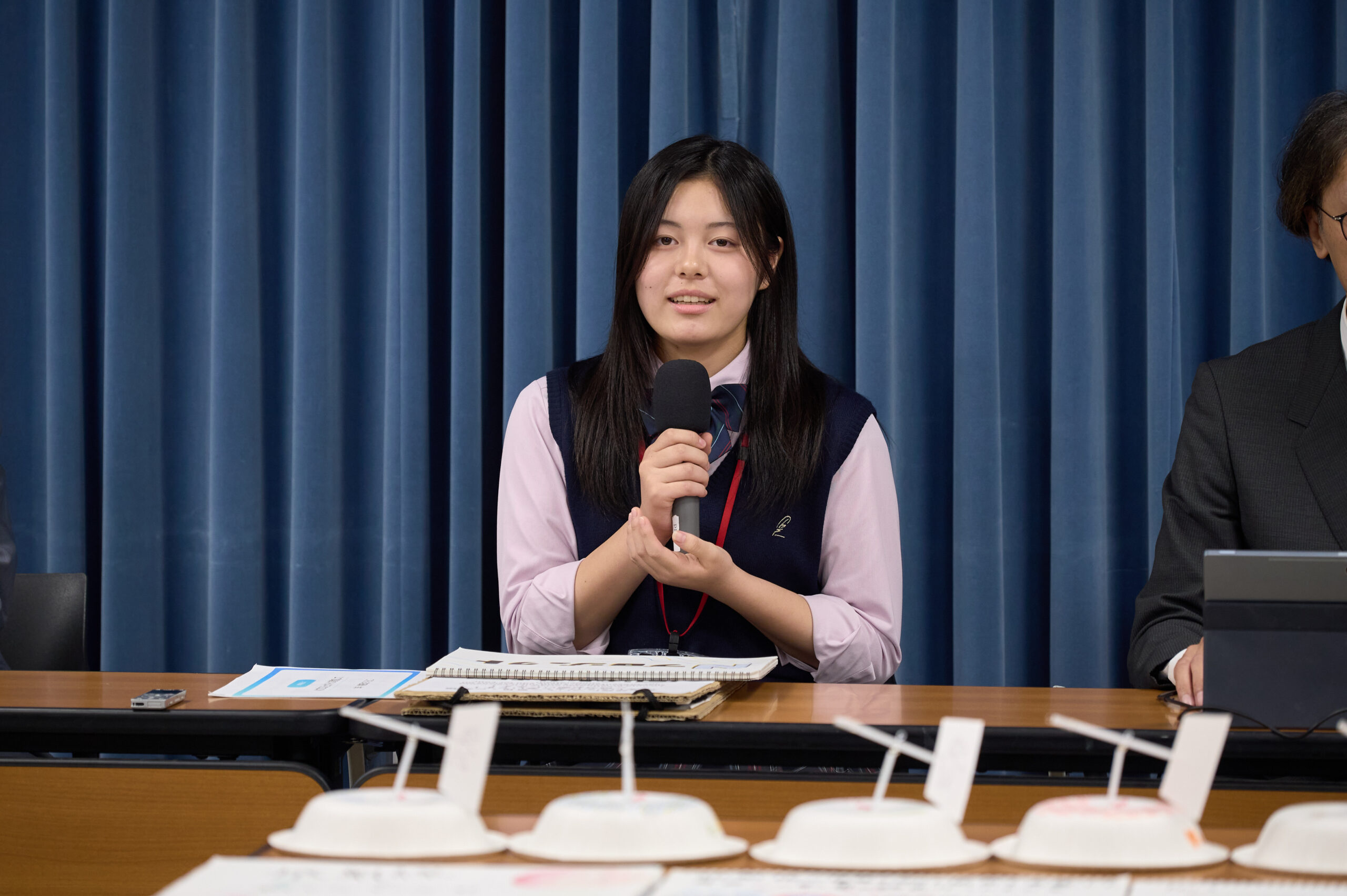 はじめに、川端氏(京都大学複合原子力科学研究所・特任教授)より、プロジェクトが数年で多くの賛同を得るに至った経緯や、アウトプットを軸とした教育の効果について同席している生徒の生の声を聞いていただきたい旨を開会の言葉として述べられました。つづいて、平野校長からは従来の教育とは異なる「学校教育と研究の知を結びつける手法」によって豊かな学びが創出されていることへの驚きと同時に、学力中間層に位置する生徒たちが活動を通して自己評価を高め、大きな成長を遂げている姿を目の当たりにしている喜びを伝えました。