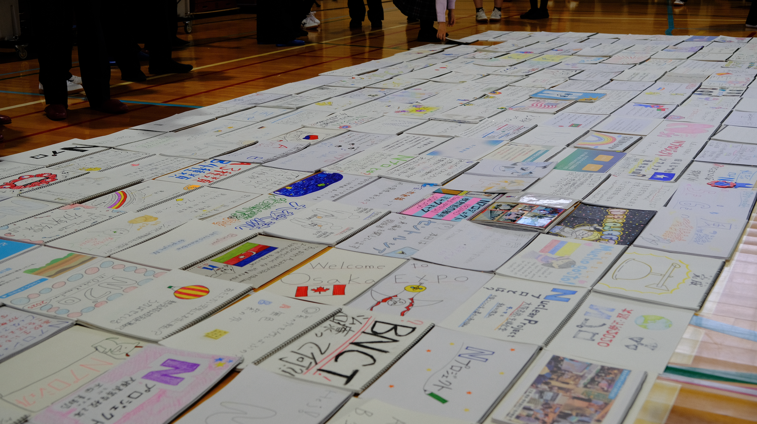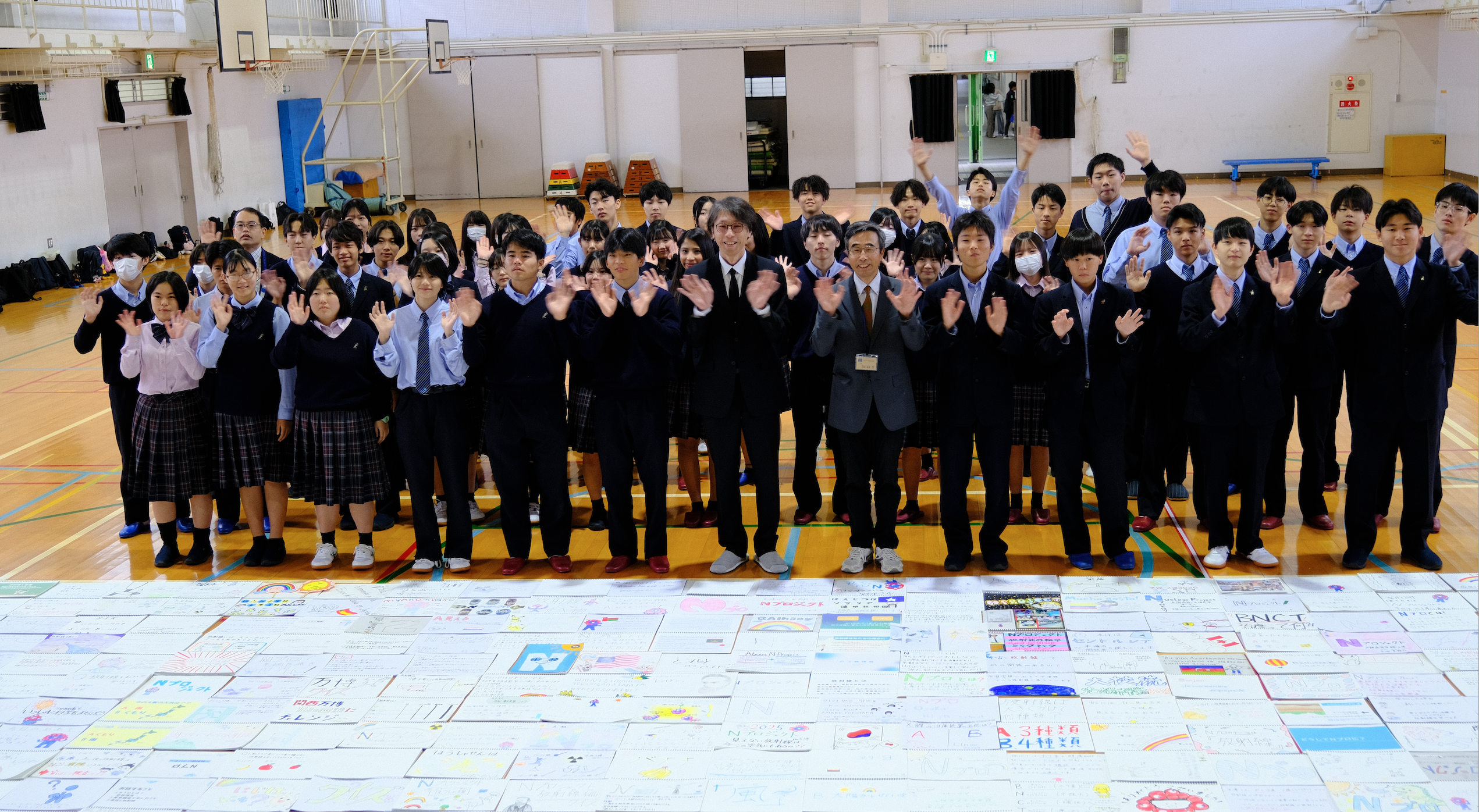 この日は原子力産業新聞社の方が引き続き取材に来られ、体育館に一部ではありますがこれまでのスケッチブックを並べて生徒との集合写真を撮ったり、ドローン飛ばして動画を撮影したり、これまでにない取材で生徒たちも盛り上がりました。